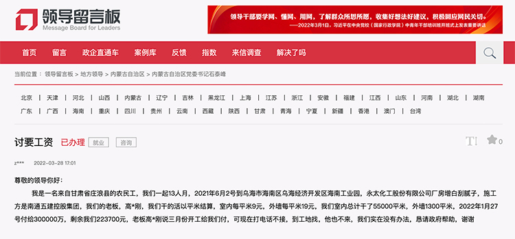 這名網友在人民網“領導留言板”留言表示,自己來自甘肅省莊浪縣,和工友一起,于2021年6月2日來到內蒙古自治區烏海市海南區烏海經濟開發區海南工業園,為一企業廠房增白刮膩子。