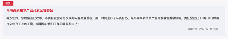 接到留言后,烏海高新技術產業開發區管委會作出答復,烏海市委督查室對網友反映的問題高度重視,第一時間進行了認真督辦,經烏海高新技術產業開發區管委會協調,責任企業已于3月30日付清拖欠網友及工友的工資。