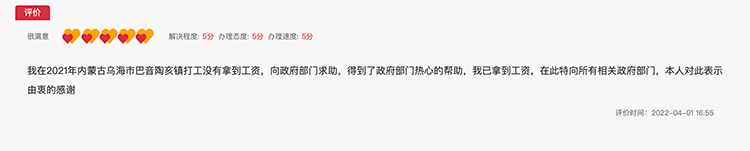 4月1日,網友再次留言并給出“五心”好評,“我在2021年內蒙古烏海市海南區打工沒有拿到工資,向政府部門求助,得到了政府部門熱心的幫助,我已拿到工資,在此特向所有相關政府部門,表示由衷的感謝。”