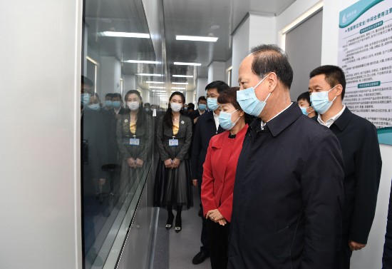 4月8日,自治區黨委書記、人大常委會主任石泰峰,自治區黨委副書記、自治區主席王莉霞,與參加自治區推進高質量發展重大項目建設動員大會代表一起觀摩尚德艾康藥業有限公司抗癌藥物研發及中試基地項目。內蒙古日報社融媒體記者 袁永紅 攝