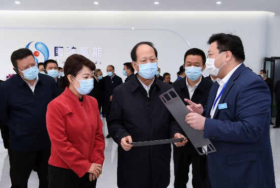4月8日,自治區黨委書記、人大常委會主任石泰峰,自治區黨委副書記、自治區主席王莉霞,與參加自治區推進高質量發展重大項目建設動員大會代表一起觀摩國鴻氫能科技有限公司鴻氫能商用車動力系統集成生產項目。內蒙古日報社融媒體記者 袁永紅 攝