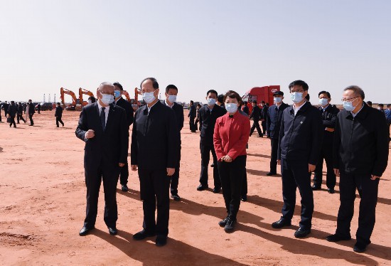 4月8日上午,自治區黨委書記、人大常委會主任石泰峰,自治區黨委副書記、自治區主席王莉霞出席鄂爾多斯市隆基光伏科技有限公司光伏全產業鏈項目奠基儀式。內蒙古日報社融媒體記者 袁永紅 攝