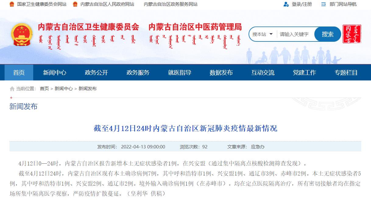 截至4月12日24時,內蒙古自治區現有本土確診病例7例,其中呼和浩特市1例、興安盟1例、通遼市3例、赤峰市2例。本土無癥狀感染者5例,其中呼和浩特市1例、興安盟2例、通遼市2例。境外輸入確診病例1例(在赤峰市)。均在定點醫院隔離治療,所有密切接觸者均在指定場所集中隔離醫學觀察,嚴防疫情擴散蔓延。