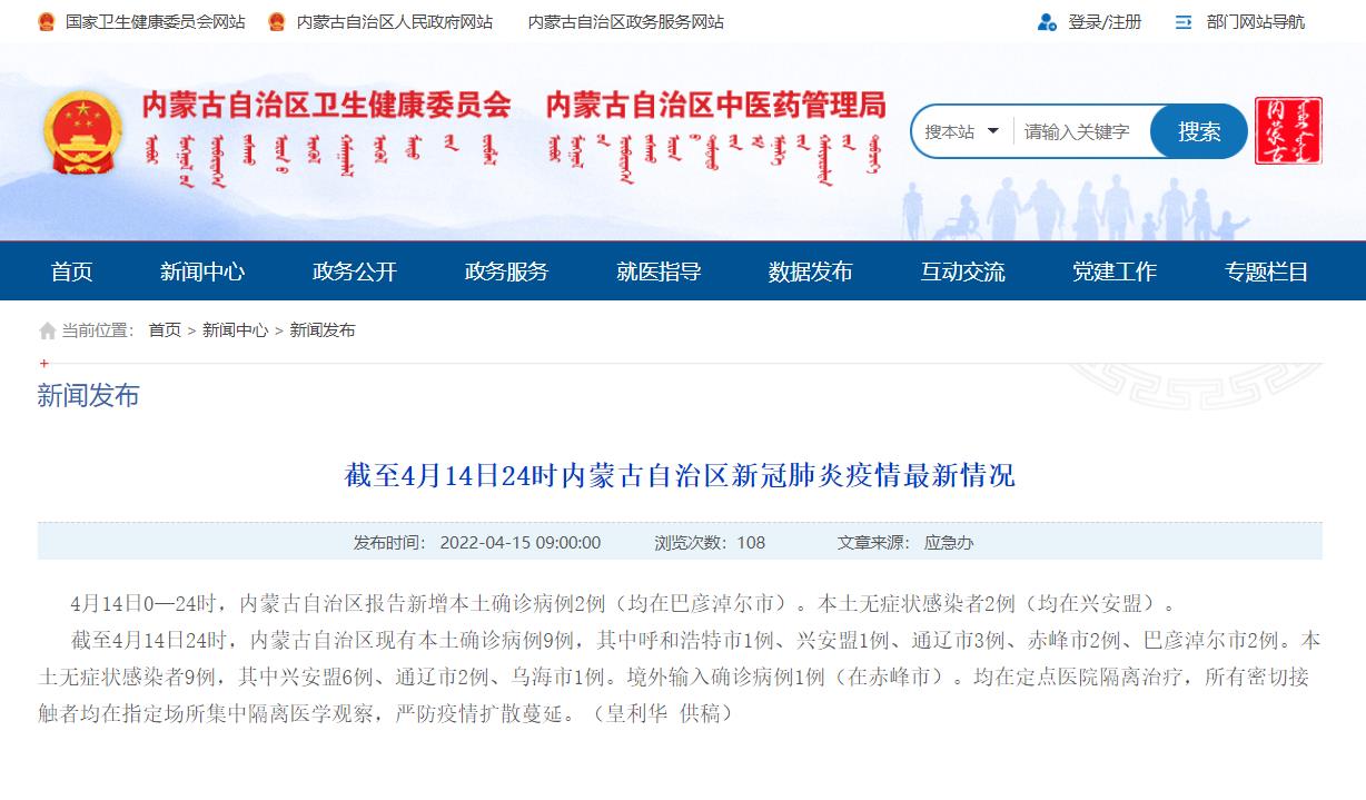 截至4月14日24時,內蒙古自治區現有本土確診病例9例,其中呼和浩特市1例、興安盟1例、通遼市3例、赤峰市2例、巴彥淖爾市2例。本土無癥狀感染者9例,其中興安盟6例、通遼市2例、烏海市1例。境外輸入確診病例1例(在赤峰市)。均在定點醫院隔離治療,所有密切接觸者均在指定場所集中隔離醫學觀察,嚴防疫情擴散蔓延。