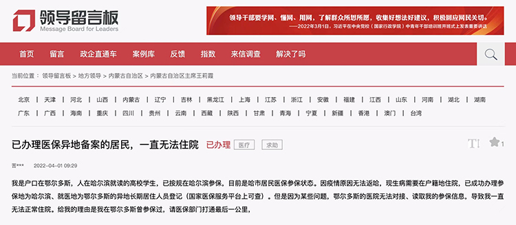 留言中表示,網(wǎng)友的戶口在鄂爾多斯市,現(xiàn)就讀于哈爾濱市的高校,目前在哈爾濱市參保。“因疫情原因無法前往哈爾濱市,現(xiàn)生病需要在戶籍地住院,已成功辦理參保地為哈爾濱、就醫(yī)地為鄂爾多斯的異地長期居住人員登記,但是鄂爾多斯市的醫(yī)院無法對接、讀取我的參保信息,導(dǎo)致我一直無法正常住院。”