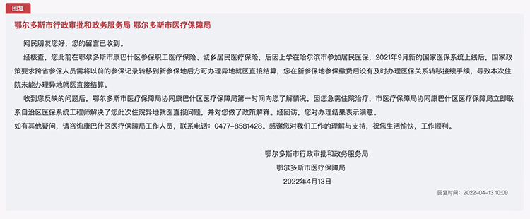 鄂爾多斯市行政審批和政務(wù)服務(wù)局、鄂爾多斯市醫(yī)療保障局對留言進(jìn)行答復(fù)。