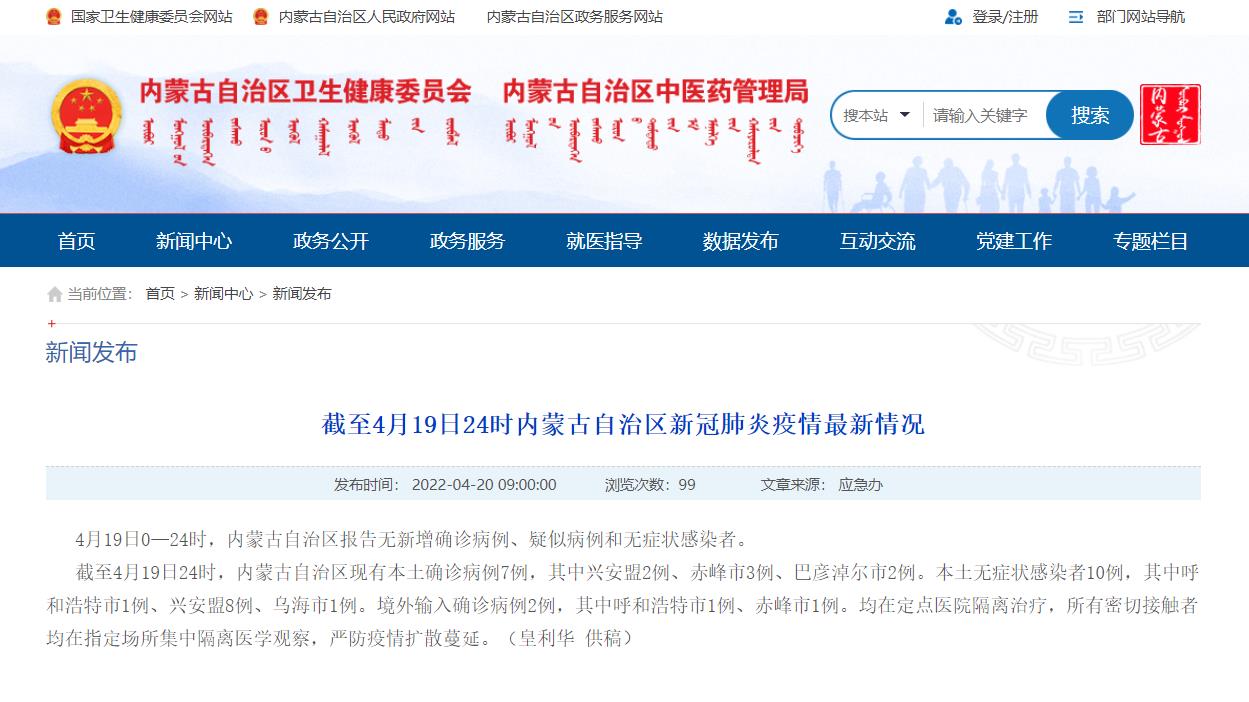 截至4月19日24時,內蒙古自治區現有本土確診病例7例,其中興安盟2例、赤峰市3例、巴彥淖爾市2例。本土無癥狀感染者10例,其中呼和浩特市1例、興安盟8例、烏海市1例。境外輸入確診病例2例,其中呼和浩特市1例、赤峰市1例。均在定點醫院隔離治療,所有密切接觸者均在指定場所集中隔離醫學觀察,嚴防疫情擴散蔓延。