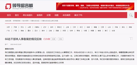 之前,這些網(wǎng)友發(fā)現(xiàn)在自己的檔案中未進(jìn)行相應(yīng)人事任職備案后,于2022年4月5日通過人民網(wǎng)“領(lǐng)導(dǎo)留言板”反映了該問題。“我們?cè)诂F(xiàn)崗位上從事管理工作已經(jīng)十八年之久,其中有幾位馬上面臨退休,隨著錫盟事業(yè)單位改革的持續(xù)推進(jìn),在核定崗位時(shí),檔案里并沒有相應(yīng)人事任職備案,涉及到退休待遇,期間盟交通運(yùn)輸局曾去勞動(dòng)人事部門協(xié)調(diào)過此事,至今無果,我們的問題究竟怎樣解決?”