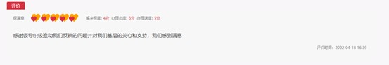 4月18日,網(wǎng)友再次留言并給出“五心”好評(píng),“感謝領(lǐng)導(dǎo)積極推動(dòng)我們反映的問題并對(duì)我們基層的關(guān)心和支持,我們感到滿意。”