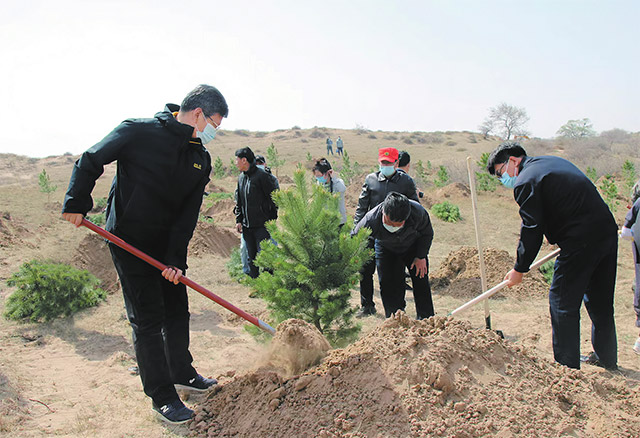 自治區黨委常委、通遼市委書記孟憲東同當地干部職工一起參加義務植樹活動,共同為通遼大地植下一片片新綠。 記者 任杰 攝