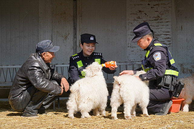 戍邊夫妻警務室的成立,大大加強了邊境重點地段、復雜區域的巡邏防控,也及時為困難群眾撐起了“保護傘”。澆樹、喂羊、剪駝絨......徐乃超和李文娜總是竭盡所能地幫助當地牧民解決生產生活中的困難。恩圖格日勒是銀根蘇木查干扎德蓋嘎查的一戶牧民,妻子陪孩子在城里上學,恩圖格日勒和70多歲的老母親留在牧區,靠放牧維持生計。春季是最忙的時候,徐乃超和李文娜在得知他家的情況后,立刻趕來幫忙。“干活麻利的呢,不怕臟不怕累,經常過來看見我們干活就幫一把。”恩圖格日勒心存感激地說。