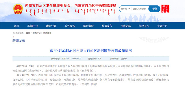人民網呼和浩特4月23日電(張雪冬)4月23日,據內蒙古衛健委通報,4月22日0—24時,內蒙古自治區報告新增境外輸入確診病例6例(均由首都機場國際航班分流至呼和浩特白塔國際機場)。本土確診病例治愈出院1例(在赤峰市)。境外輸入確診病例治愈出院1例(在赤峰市)。
