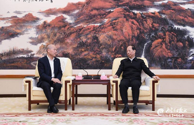 4月22日下午,自治區(qū)黨委書記、人大常委會主任石泰峰在呼和浩特會見華友鈷業(yè)集團董事長陳雪華。內蒙古日報社融媒體記者袁永紅攝