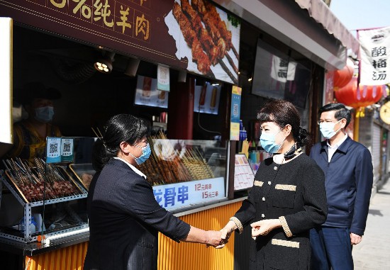 4月24日下午,自治區(qū)黨委副書(shū)記、自治區(qū)主席王莉霞在呼和浩特市萬(wàn)達(dá)步行街,隨機(jī)走進(jìn)幾家店面,向商戶(hù)詳細(xì)了解經(jīng)營(yíng)情況,勉勵(lì)他們要堅(jiān)定信心,渡過(guò)難關(guān)。內(nèi)蒙古日?qǐng)?bào)社融媒體記者韓卿立攝