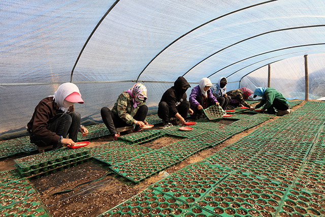 在奈曼旗東明鎮上奈林村的西瓜育秧基地,技術人員正在向營養缽里播種種子。侯顯峰攝