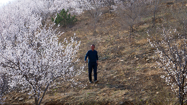 在奈曼旗平頂山村,李久新走在杏林里,為杏樹修理枝杈和雜草。