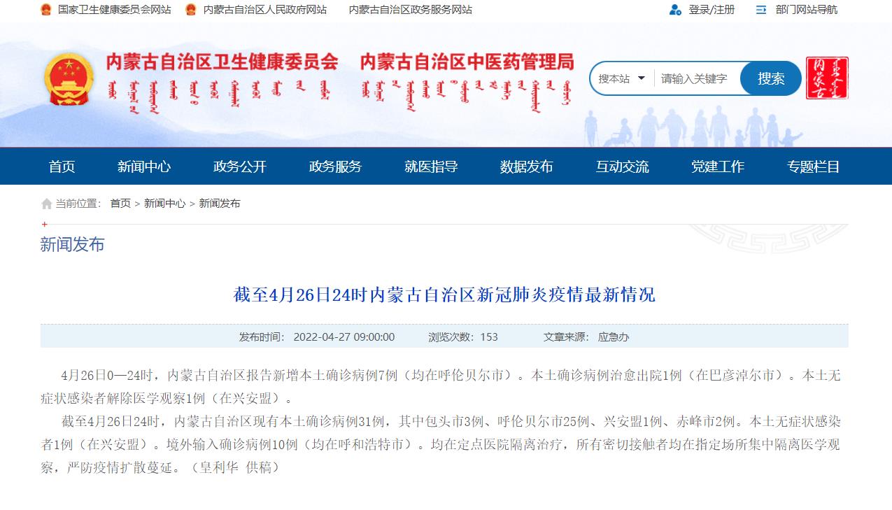 人民網呼和浩特4月27日電(趙夢月)4月27日,據內蒙古衛健委通報,4月26日0—24時,內蒙古自治區報告新增本土確診病例7例(均在呼倫貝爾市)。本土確診病例治愈出院1例(在巴彥淖爾市)。本土無癥狀感染者解除醫學觀察1例(在興安盟)。