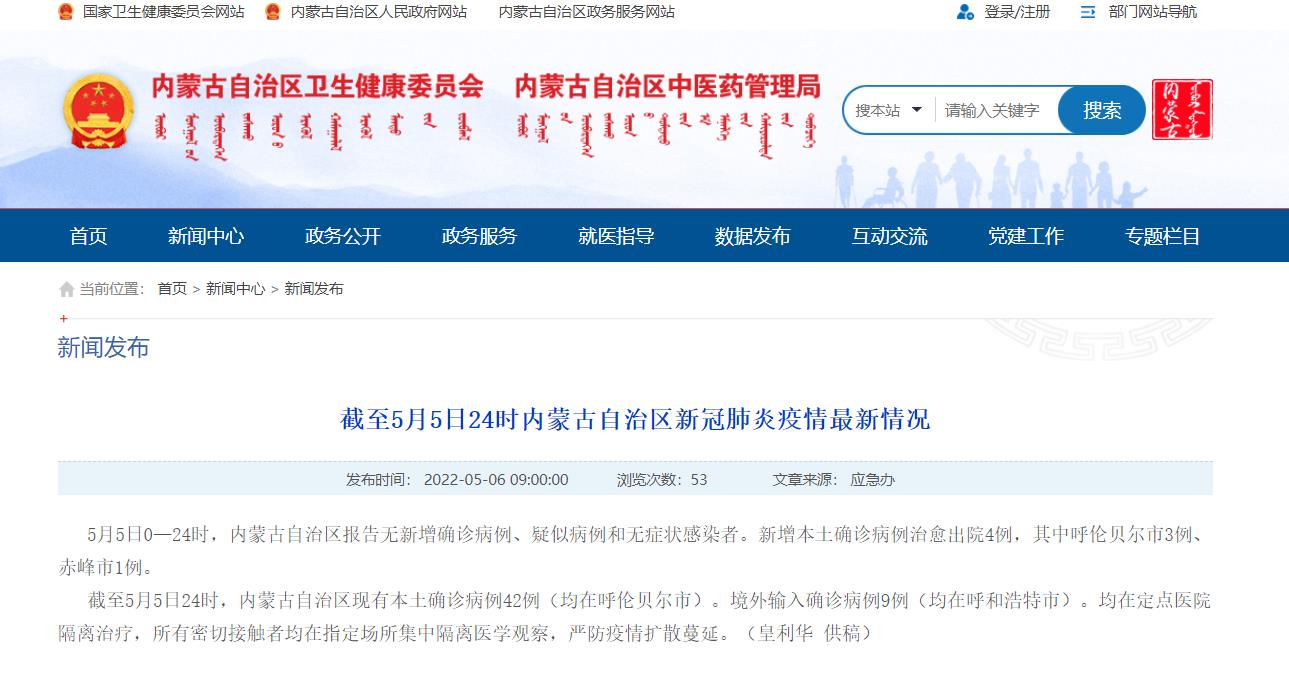 截至5月5日24時,內蒙古自治區現有本土確診病例42例(均在呼倫貝爾市)。境外輸入確診病例9例(均在呼和浩特市)。均在定點醫院隔離治療,所有密切接觸者均在指定場所集中隔離醫學觀察,嚴防疫情擴散蔓延。