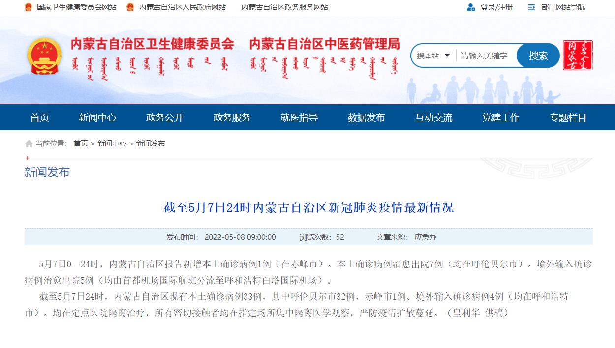 人民網呼和浩特5月8日電(趙夢月)5月8日,據內蒙古衛(wèi)健委通報,5月7日0—24時,內蒙古自治區(qū)報告新增本土確診病例1例(在赤峰市)。本土確診病例治愈出院7例(均在呼倫貝爾市)。境外輸入確診病例治愈出院5例(均由首都機場國際航班分流至呼和浩特白塔國際機場)。