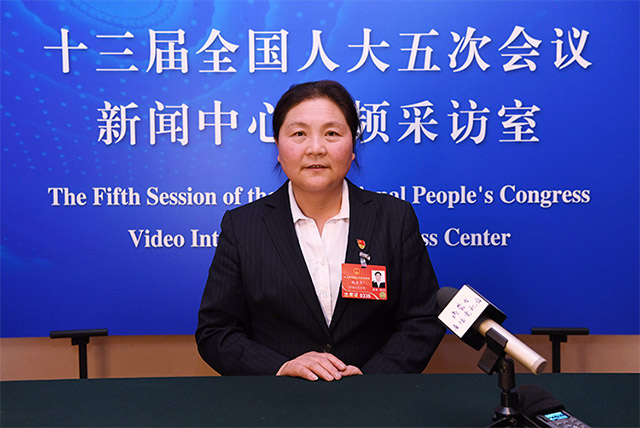 第十三屆全國人大代表、內蒙古自治區赤峰市松山區大廟鎮小廟子村黨支部書記趙會杰在接受記者采訪。袁永紅 攝