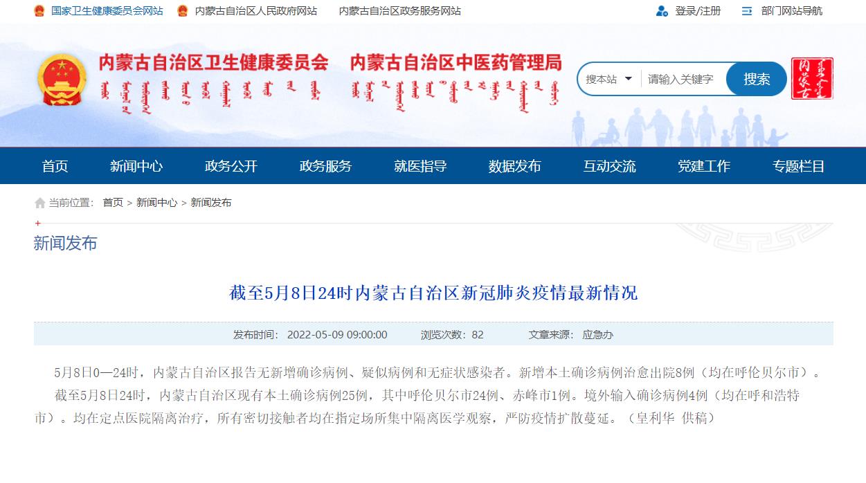 截至5月8日24時,內蒙古自治區現有本土確診病例25例,其中呼倫貝爾市24例、赤峰市1例。境外輸入確診病例4例(均在呼和浩特市)。均在定點醫院隔離治療,所有密切接觸者均在指定場所集中隔離醫學觀察,嚴防疫情擴散蔓延。