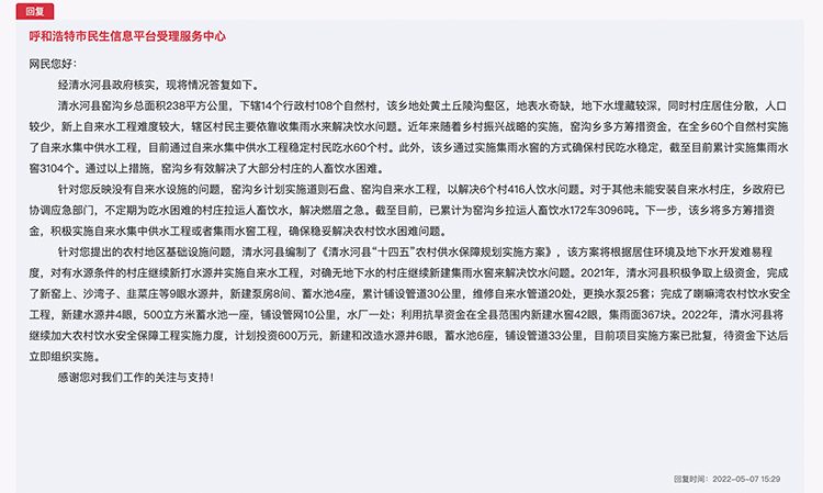 收到留言后,呼和浩特市民生信息平臺受理服務中心對網友提出的問題進行答復。經清水河縣政府核實,清水河縣窯溝鄉總面積238平方公里,下轄14個行政村108個自然村,該鄉地處黃土丘陵溝壑區,地表水奇缺,地下水埋藏較深,同時村莊居住分散,人口較少,新上自來水工程難度較大,轄區村民主要依靠收集雨水來解決飲水問題。近年來隨著鄉村振興戰略的實施,窯溝鄉多方籌措資金,在全鄉60個自然村實施了自來水集中供水工程,目前通過自來水集中供水工程穩定村民吃水60個村。此外,該鄉通過實施集雨水窖的方式確保村民吃水穩定,截至目前累計實施集雨水窖3104個。通過以上措施,窯溝鄉有效解決了大部分村莊的人畜飲水困難。