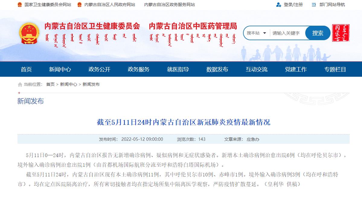 截至5月11日24時,內蒙古自治區現有本土確診病例11例,其中呼倫貝爾市10例、赤峰市1例。境外輸入確診病例3例(均在呼和浩特市)。均在定點醫院隔離治療,所有密切接觸者均在指定場所集中隔離醫學觀察,嚴防疫情擴散蔓延。