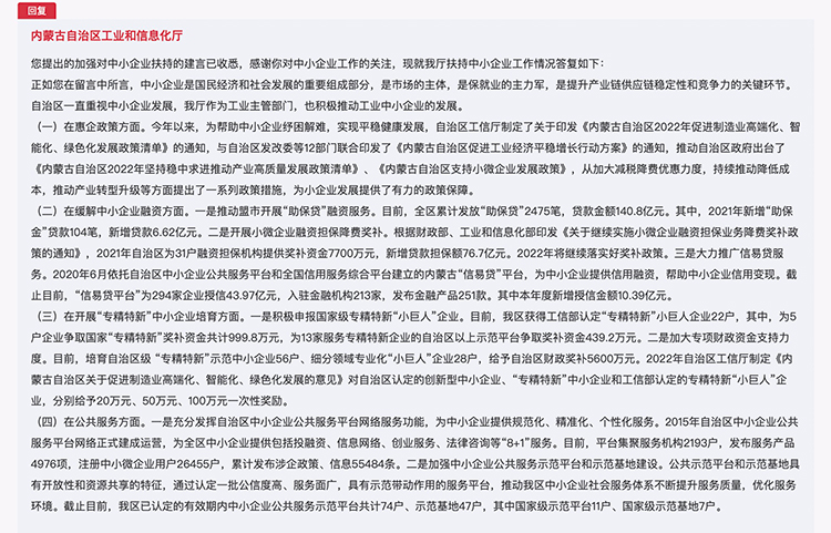收到留言后,內蒙古自治區工業和信息化廳作出答復,正如網友留言中所言,中小企業是國民經濟和社會發展的重要組成部分,是市場的主體,是保就業的主力軍,是提升產業鏈供應鏈穩定性和競爭力的關鍵環節。自治區一直重視中小企業發展,內蒙古自治區工業和信息化廳作為工業主管部門,也積極推動工業中小企業的發展。