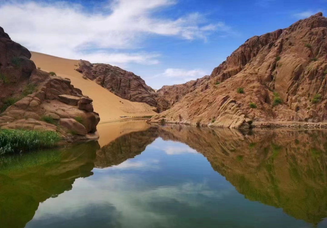 一邊蒼山峻峭,一邊黃沙萬里,湖水處于山體和黃沙之間,水平如鏡,清澈見底……日前,在阿右旗阿拉騰敖包鎮(zhèn)“大漠天池”景區(qū),前來觀光旅游的游客們看到如此漂亮的自然風(fēng)光后紛紛拿起相機(jī)、手機(jī)拍個不停,感嘆眼前任何一個角度的美景都是一張美麗的明信片。