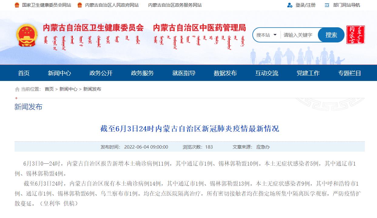 人民網呼和浩特6月4日電(趙夢月)6月4日,據內蒙古衛健委通報,6月3日0—24時,內蒙古自治區報告新增本土確診病例11例,其中通遼市1例、錫林郭勒盟10例。本土無癥狀感染者5例,其中通遼市1例、錫林郭勒盟4例。