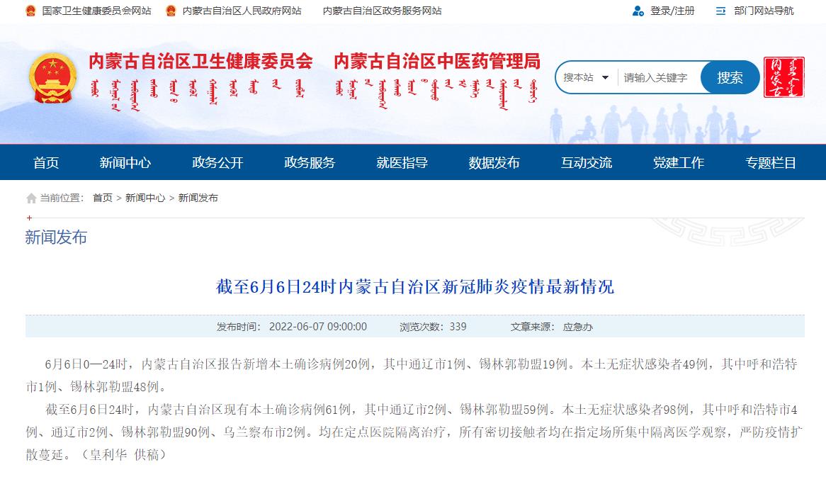 人民網呼和浩特6月7日電(趙夢月)6月7日,據內蒙古衛健委通報,6月6日0—24時,內蒙古自治區報告新增本土確診病例20例,其中通遼市1例、錫林郭勒盟19例。本土無癥狀感染者49例,其中呼和浩特市1例、錫林郭勒盟48例。
