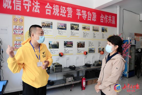 6月8日,王莉霞來到二連浩特市美團營業部,了解疫情期間安全運送措施。內蒙古日報社融媒體記者 韓卿立攝
