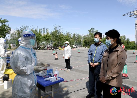 6月8日,王莉霞來到二連浩特市奧林匹克公園核酸采樣點,詢問了解核酸檢測工作閉環管理措施落實情況。內蒙古日報社融媒體記者 韓卿立攝