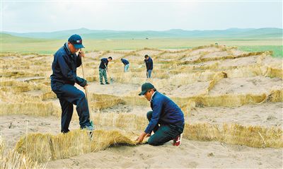 錫林郭勒盟東烏珠穆沁旗滿都寶拉格鎮,蒙草生態環境(集團)股份有限公司工作人員在鋪設沙障,修復草原生態。記者 馬建荃 攝