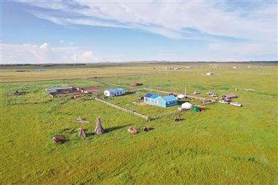 航拍呼倫貝爾市鄂溫克族自治旗錫尼河東蘇木布日都嘎查巴拉布爾家。巴拉布爾家草場禁牧面積1000多畝,草畜平衡面積2200多畝,所有草場都申報了草原生態補獎項目。在草原生態保護補助獎勵政策推動下,內蒙古草原生態、牧民生活持續向好。記者 馬建荃 攝