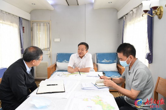 孫紹騁在列車上認真聽取自治區有關部門關于全區防沙治沙工作情況匯報。內蒙古日報社融媒體記者 袁永紅攝