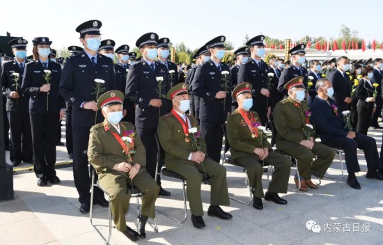 敬獻花籃儀式由自治區黨委常委、呼和浩特市委書記包鋼主持。自治區黨委、人大常委會、政府、政協、高級人民法院、人民檢察院和內蒙古軍區、武警內蒙古總隊省軍級領導出席,老戰士、烈士親屬代表,解放軍和武警官兵代表,政法干警代表,呼和浩特市各族各界干部群眾參加。(內蒙古日報社融媒體記者 劉曉冬 章奎)