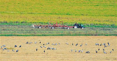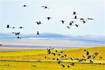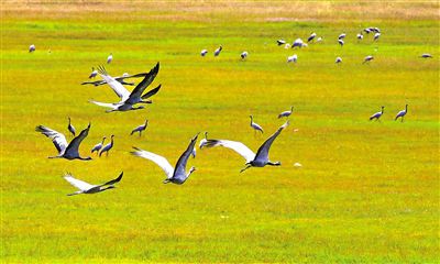 在這優美畫卷中,蓑羽鶴就是額侖草原上的精靈,給草原平添了生命的活力。蓑羽鶴是鶴類中個體最小者,對生態環境質量要求很高。從之前的形單影只,到現在的成群結隊,蓑羽鶴對額侖草原的青睞,足以說明了額侖草原生態環境的保護成效。