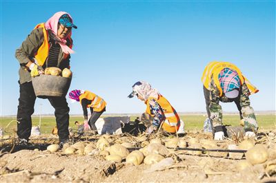 在烏蘭察布市四子王旗,農(nóng)民們正在收馬鈴薯。今年,內(nèi)蒙古馬鈴薯主產(chǎn)區(qū)多個(gè)高產(chǎn)地塊畝產(chǎn)超4000公斤。 記者 懷特烏勒斯 攝