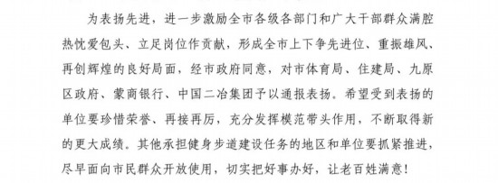 包頭人以實際行動詮釋了愛包頭、做貢獻,跑出包頭體育加速度。近日,包頭市政府予以市體育局等單位通報表揚。據了解,包頭市將對30個既有公園植入體育元素改造升級為體育公園,全市塑膠健身步道將達到30公里以上。(劉存永)
