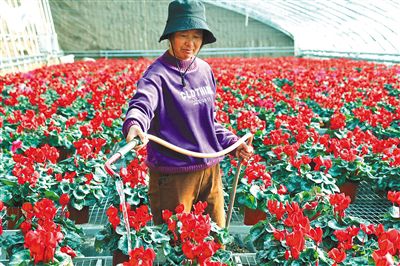 在喀喇沁旗錦山鎮(zhèn)陽坡村育苗基地,工人正在澆花。近年來,喀喇沁旗大力發(fā)展“高精尖”農(nóng)業(yè)特色優(yōu)勢(shì)產(chǎn)業(yè),形成了蔬菜、中藥材、花卉等產(chǎn)業(yè)發(fā)展新格局,并通過農(nóng)業(yè)產(chǎn)業(yè)化經(jīng)營,創(chuàng)造更多就業(yè)崗位,輻射帶動(dòng)周邊農(nóng)民就業(yè),有效促進(jìn)了農(nóng)業(yè)增效和農(nóng)民增收。 李富 攝