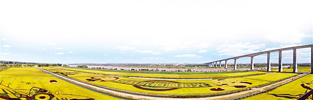 綠油油的稻苗齊刷刷地挺立在碧波蕩漾的萬頃水域間,一望無垠,生機無限。其上方500米玻璃棧道成為周邊游網紅打卡地。