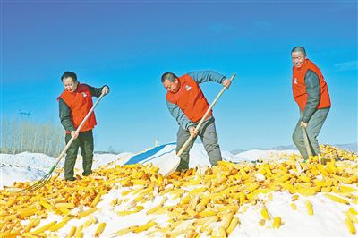 呼倫貝爾農(nóng)墾扎蘭屯農(nóng)牧場第一連隊工人正在清理玉米上的積雪,確保顆粒歸倉。韓冷 攝