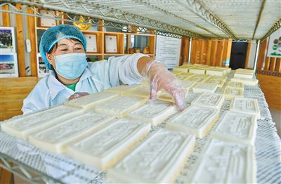 內(nèi)蒙古瑪拉沁食品有限公司工作人員正在制作奶豆腐。該公司依托通遼市科爾沁左翼后旗黃牛資源的優(yōu)勢,選用當?shù)貎?yōu)質(zhì)牛奶進行新加工、深加工、精加工,隨著企業(yè)的發(fā)展壯大,越來越多的農(nóng)牧民借助這個平臺實現(xiàn)了就地就業(yè)和增收致富。記者 孟和朝魯 攝