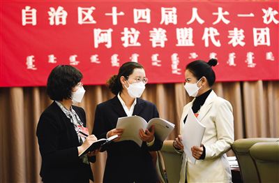 1月14日,阿拉善盟代表團敖特根其其格(右)、高娃(中)、姬永玲三位代表在會議間隙認真討論政府工作報告。記者 孟和朝魯 攝