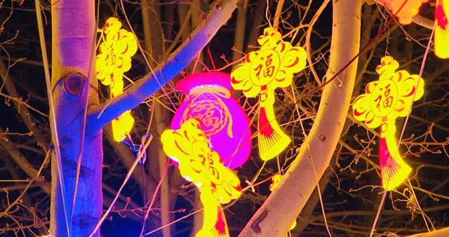 在蘇力迪、毛蓋圖、察干陶勒蓋等街道旁的樹枝上已懸掛出“風(fēng)車”“蝴蝶”“星星”等燈飾,樹干則環(huán)繞著暖黃色的燈帶,漫天的桃心燈如同閃耀的星辰一般,點(diǎn)綴街道,成為這些街道夜色中的獨(dú)特景觀,營造出濃濃的“年味兒”。瑪拉迪街,又是另一番美景。除了樹干上纏繞的燈帶外,樹上懸掛著五彩斑斕的福袋、紅燈籠等燈飾,在朦朧的暖色光影下,倍感溫馨。