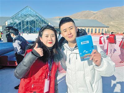 創業青年劉瑜(左)與同伴打卡呼和浩特市馬鬃山滑雪場,宣介內蒙古旅游。 (劉瑜供圖)