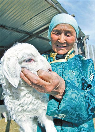 在呼倫貝爾市陳巴爾虎旗巴彥哈達蘇木,71歲的牧民蘇金花拉抱著今春出生的第一只小羊羔,喜笑顏開。 本報記者 李新軍 攝