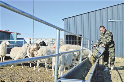 通遼市扎魯特旗烏力吉木仁蘇木蘇布日根塔拉嘎查的額爾敦寶力高正在給羊添加飼料。 韓飛 攝