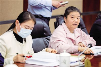 3月7日上午,全國人大代表李文玲(右)在審議立法法修正草案時認為,立法法修正草案進一步健全了立法體制,完善了立法程序,為全面建設社會主義現代化提供了法治保障。記者 于濤 攝